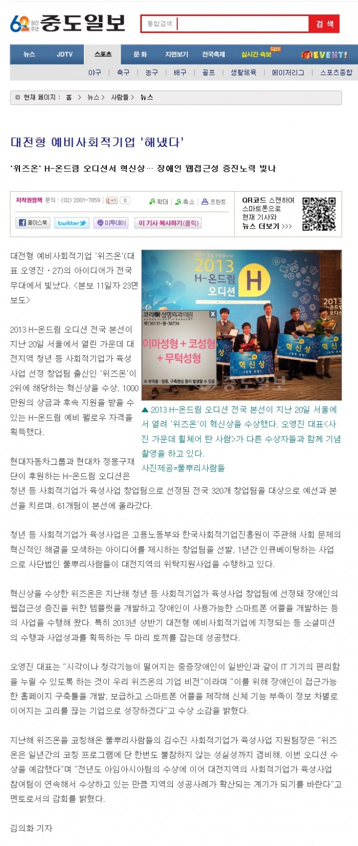 중도일보 130322 '위즈온' H-온드림 오디션서 혁신상